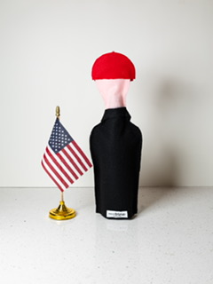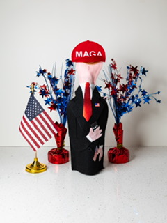 Make America Great Again! This President Trump bottle jacket is a one of a kind item, designed and handmade in the USA by an American Patriot. President Trump is dressed in his black suit and red tie along with an American flag pin in his lapel. Of course, he has his MAGA cap on. He holds his cell phone in one hand and a USA flag in the other. Bottle jacket slips over any standard wine bottle or similar type bottle.