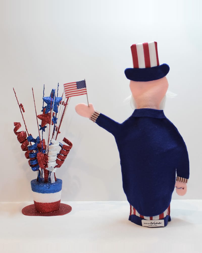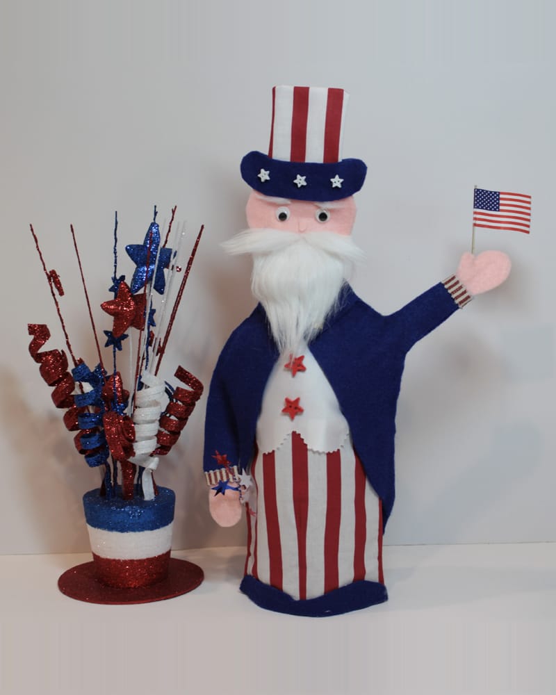 Celebrate America with Uncle Sam at your party. He’s dressed in his traditional holiday suit waving his American flag in one hand and a sparklers in the other. Fits over any standard wine bottle standing 14″ and 6 1/2 ” wide. Made of cotton, felt and other materials in a smoke free environment.
